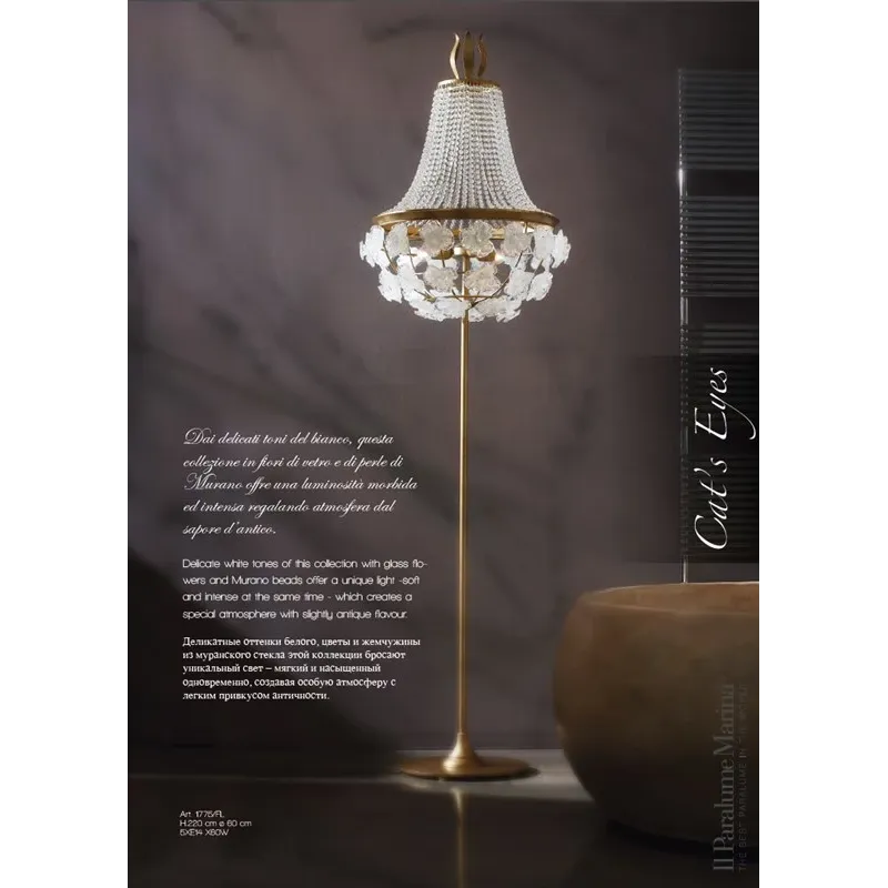 Zachwycającą propozycją jest lampa stojąca ze złotym abażurem, zdobiona złotymi kroplami murano i kroplami Asfour. Fantazyjnie połyskujące krople w połączeniu ze złotym abażurem tworzą luksusową propozycję oświetlenia do salonu, sypialni i jadalni. Lampa łączy tradycyjną formę z nowoczesną podstawą.